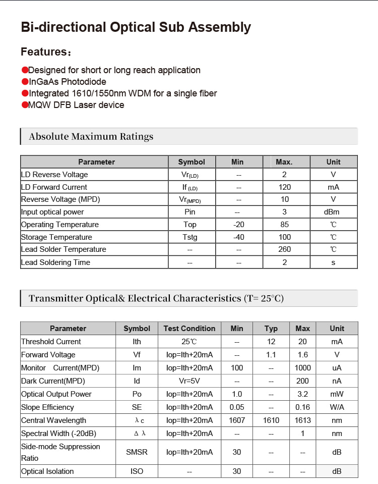 ● Integrated 1610/1550nm WDM for a single fiber